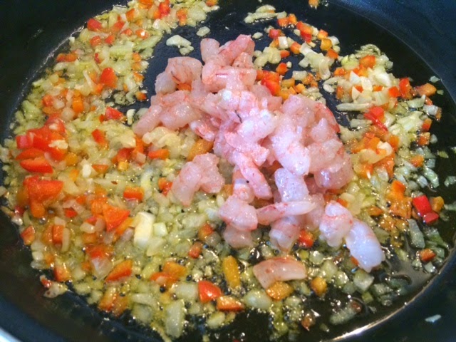 Mientras se pocha la verdura, pelar las gambas (reservar 8 gambas sin pelar para decorar) y cortarlas en 2 o en 3 trozos y cuando esté pochada la verdura incorporar a la paellera.