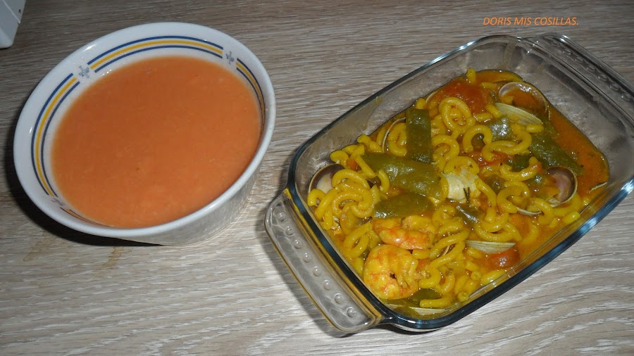 Rectificamos de sal si hiciera falta.Dejamos cocer a fuego medio hasta que los fideos estén en su punto.Yo lo he acompañado con un gazpacho que hoy apetecía por Madrid hacía calorcito.