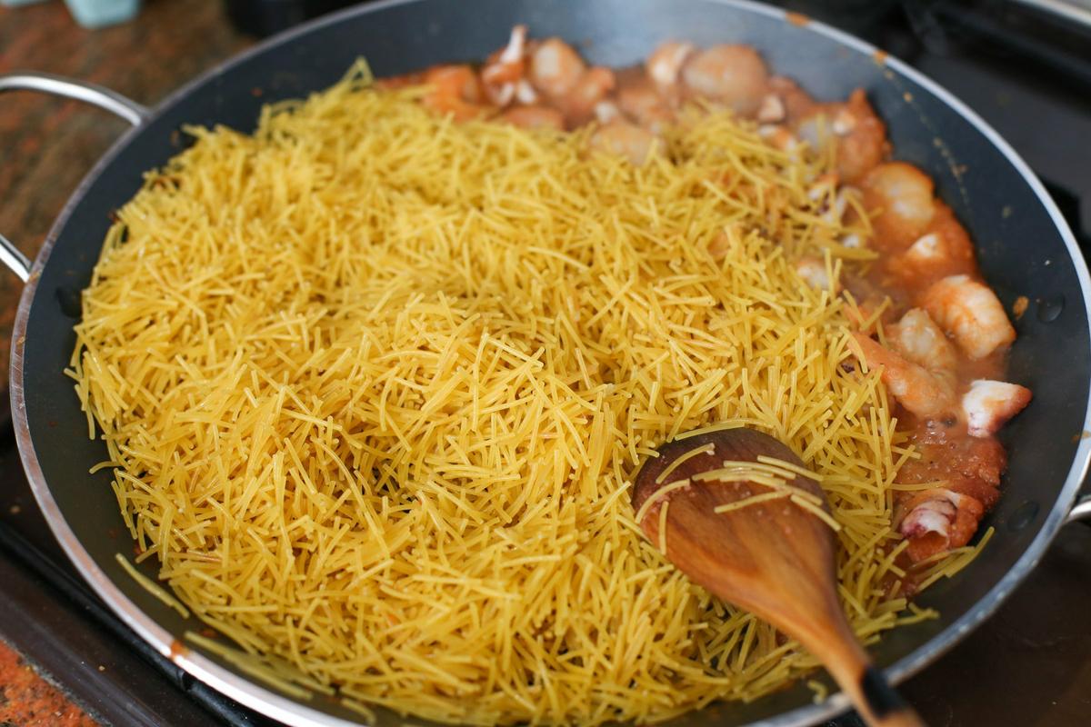 Añadir los camarones (limpios y pelados) y la sepia o calamar troceado y sofreír por algunos minutos junto con el sofrito de tomate hasta. Condimentar con una pizca de sal y una pizca de pimienta. Retirar y reservar o dejar en un extremo de la paellera. Añadir un chorrito de aceite de oliva y tostar ligeramente los fideos `por un par de minutos. Volver a añadir los mariscos y el sofrito, mezclar todo bien y de manera homogénea (procurando de que queden los mariscos bien repartidos).
