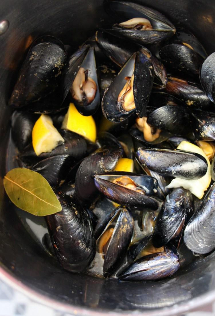 Mientras se cocina la fideuá, hacer los mejillones (choritos) al vapor. Limpiar muy bien los mejillones (con la ayuda de un cuchillo) para eliminar residuos. Lavarlos con abundante agua. En una olla grande colocar los mejillones, un chorrito de aceite de oliva, un limón en trozos, un par de hojas de laurel y pimienta a gusto junto con ⅓ de agua. Revolver un poco para que el aliño llegue a todos los mejillones, tapar y llevar a fuego medio por 6 a 8 min aproximadamente, o hasta que comiencen a abrirse. Retirar y reservar. Si tienes mejillones de distintos tamaños puede que los más grandes se demoren un poco más en abrirse, en ese caso retira los que ya están abiertos y deja unos minutos más los que todavía no se abren. Si no se abren del todo, quiere decir que esos mejillones no están buenos y debes desecharlos.