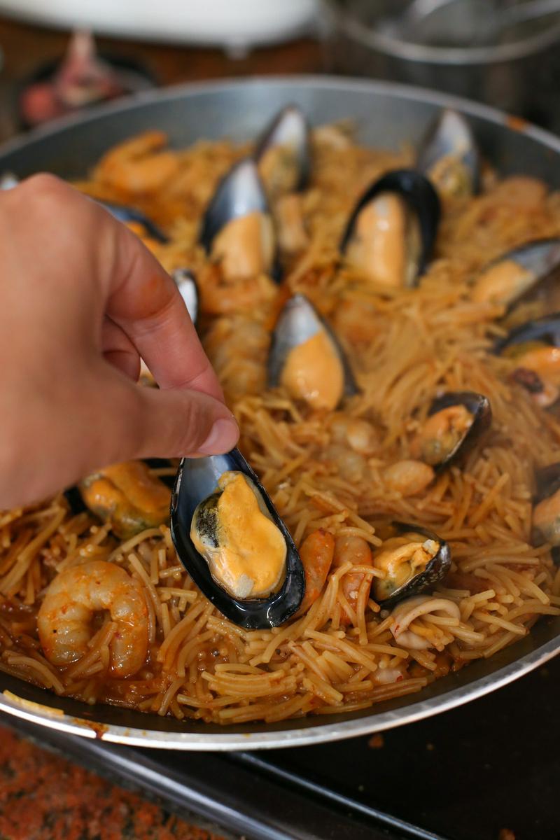 Colocar los mejillones sobre la fideuá y añadir el resto de caldo que queda. Esperar a que se absorba al 90%.