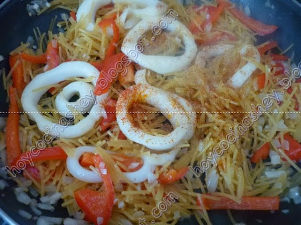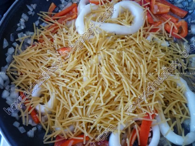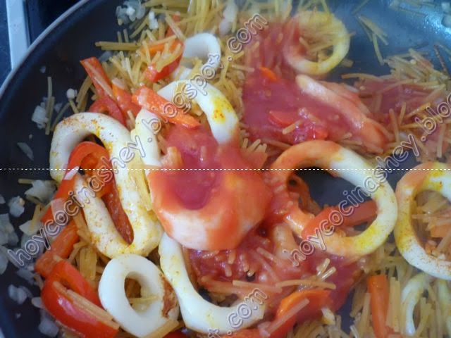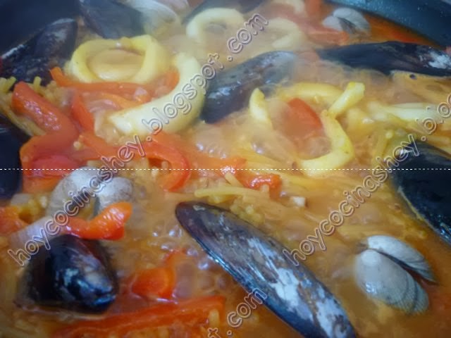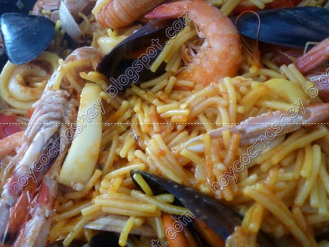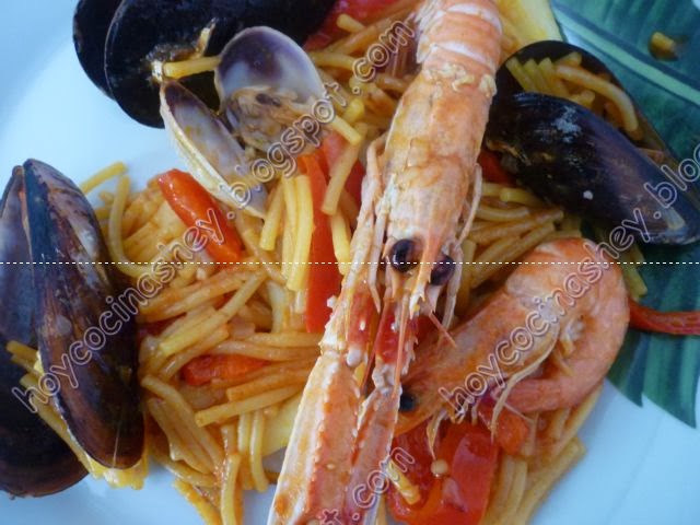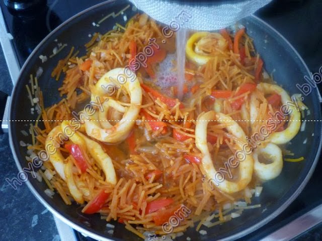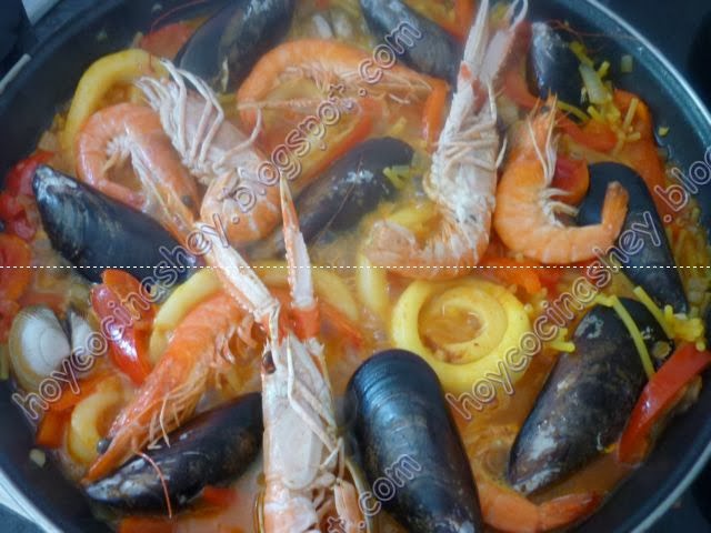 Esperamos que reduzca un poco y ponemos las cigalas y los langostinos solo para que termine de agarrar el sabor de la fideuá: