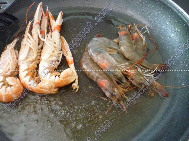 Cuando caliente ponemos las cigalas y los langostinos y cuando estén retiramos a un plato: