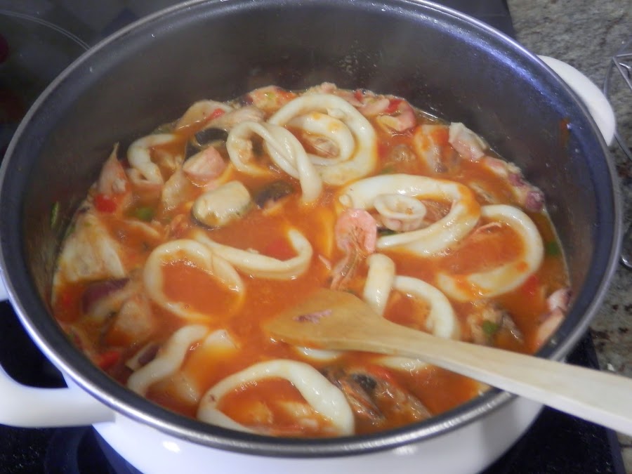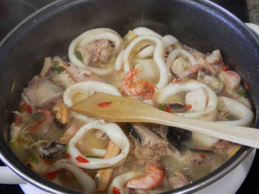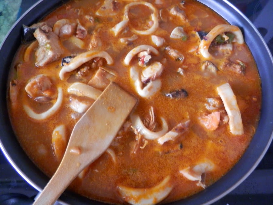 Sofreímos durante aproximadamente unos quince minutos y después añadimos el fumet y seis vasos de agua. Dejamos cocer por una hora y media aproximadamente.