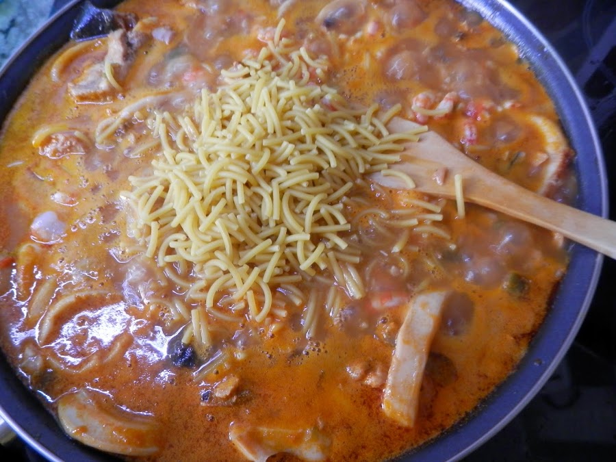 Cambiamos el preparado a una sartén o paellera y añadimos la fideuá, yo suelo poner un puñado de fideos por persona.
