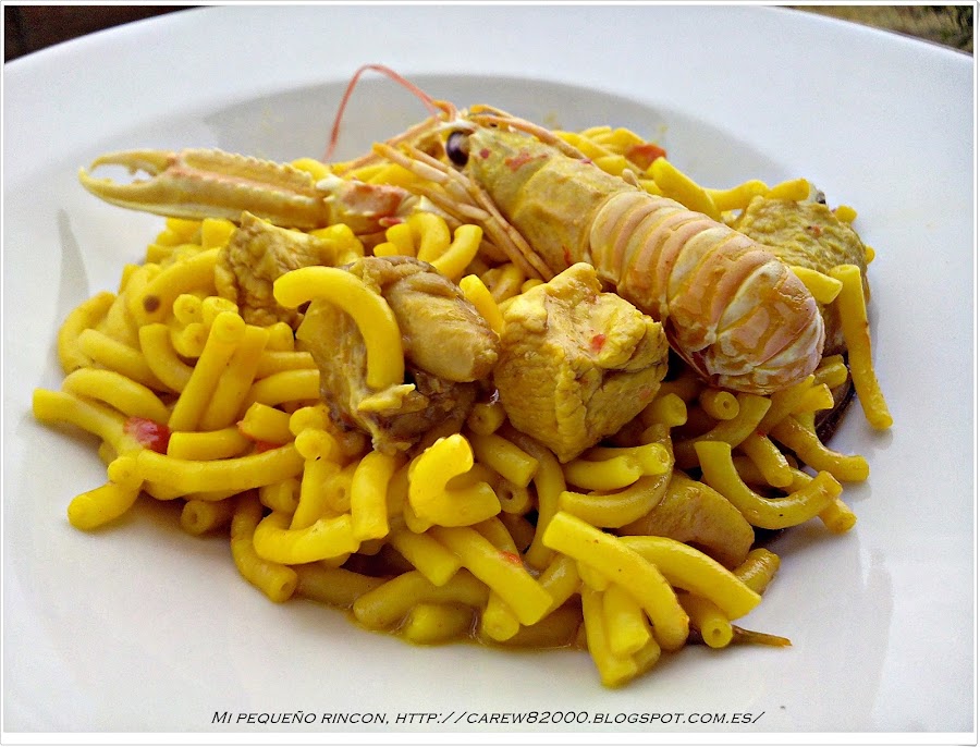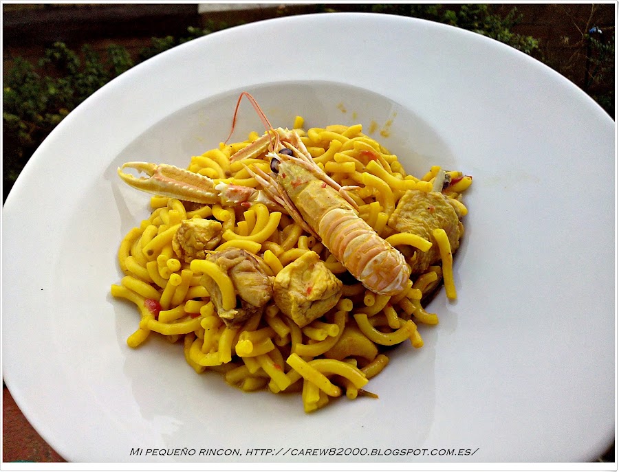 Le ponemos la fideua y la rehogamos, a continuación echamos las verduras y las cigalas y dejamos cocinar unos 3 minutos, pasado ese tiempo añadimos el caldo o fume hasta que cubran los fideos, más o menos hasta cubrir un dedo, añadimos el colorante y cuando empiece a hervir lo probamos y rectificamos de sal, suele tardar unos 15 o 20 minutos en cocer los fideos, una vez cocidos retiramos y emplatamos.