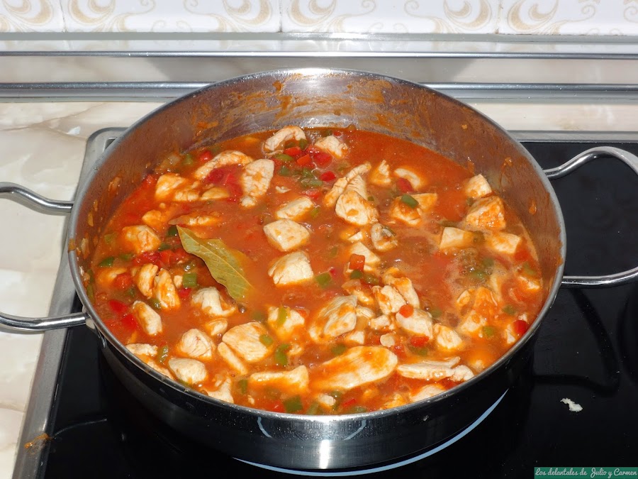 En la misma paellera, echamos un poco mas de aceite y pochamos a fuego bajo la cebolla, raspando el fondo para sacar los jugos del pollo que se hayan quedado en la misma. Cuando la cebolla esté dorada, echaremos los pimientos y la hoja de laurel y cocinaremos removiendo de vez en cuando. Salamos ligeramente y removemos hasta que comprobemos que las verduras están tiernas.
