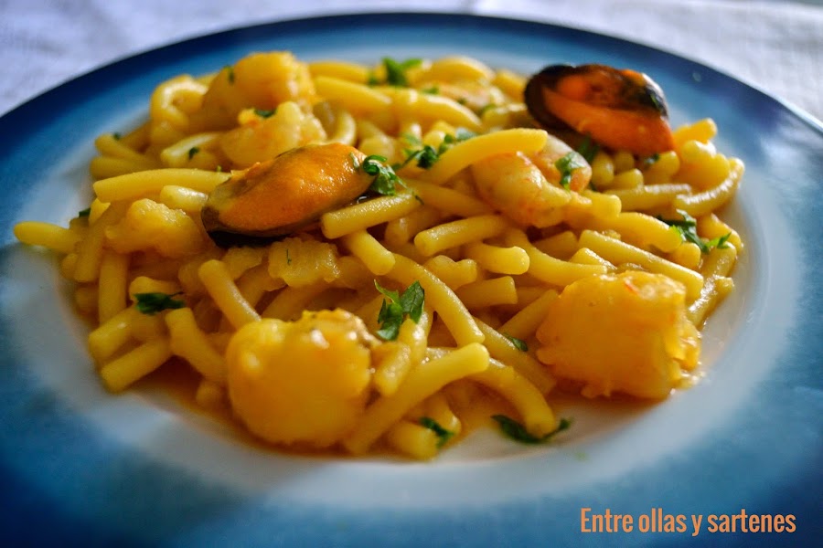Ponemos en la cazuela los fideos y las colitas de gambas, rociamos con el azafrán en polvo y cubrimos con el agua de cocción de los mejillones colada y vamos añadiendo caldo de pescado según lo vaya necesitando. Dejamos cocer unos 9 minutos.