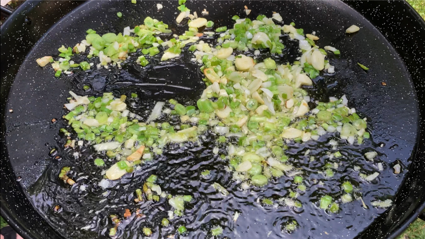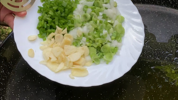 Pon a sofreír la cebolleta -cebolla de verdeo-, el pimiento verde y al ajo.