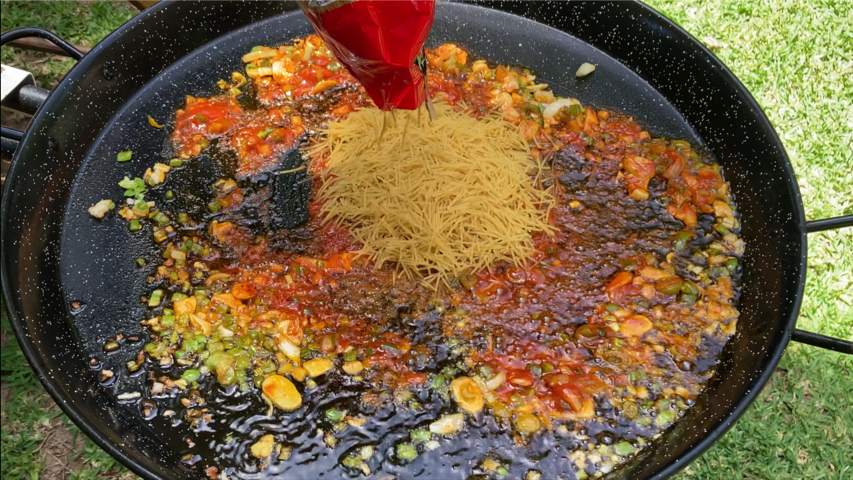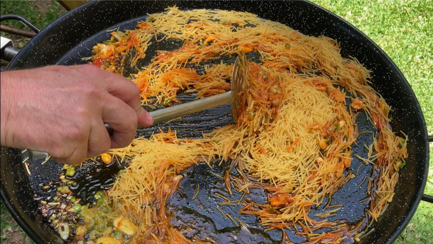 Cuando el tomate se haya sofrito pon los fideos y dóralos un par de minutos salteándolos.