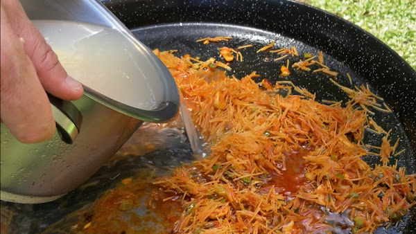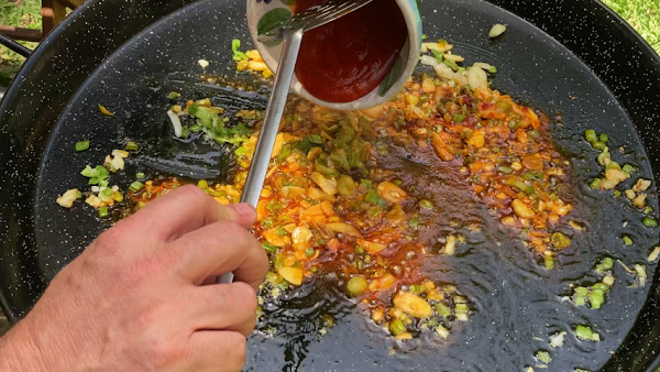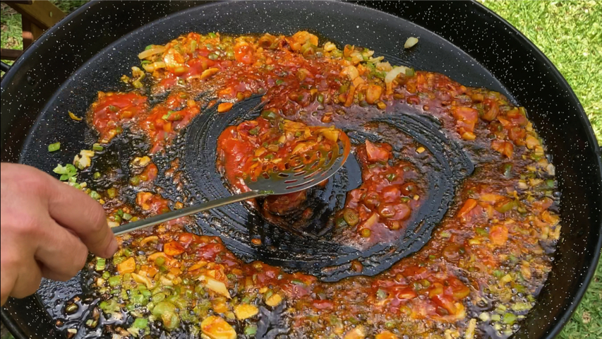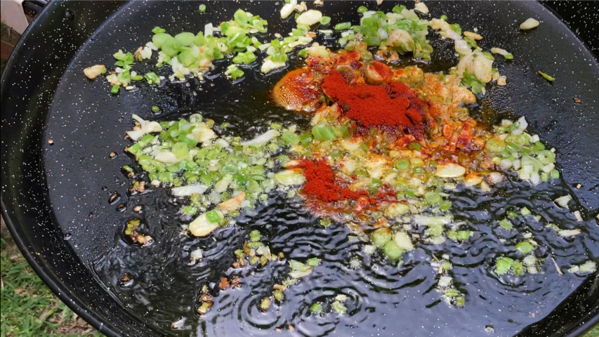 En cuanto cebolla, pimiento y ajo estén sofritos añade el pimentón dulce y el picante.