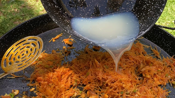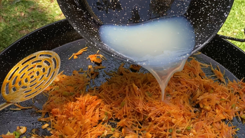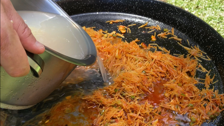 Vierte el caldo, mezcla y deja que se hagan los fideos y el caldo sobrante se evapore.