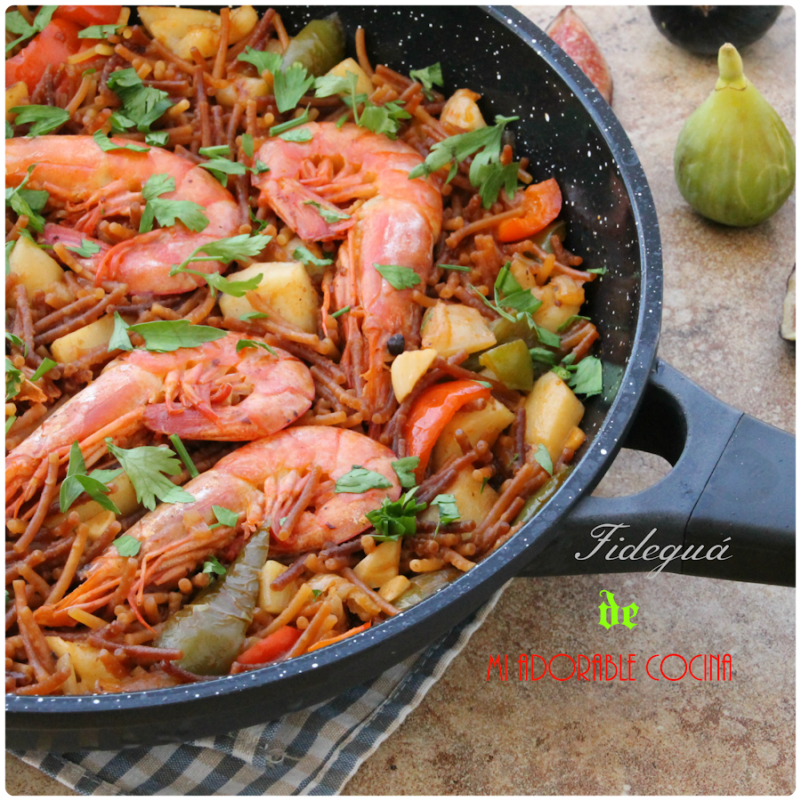 .Echamos las gambas y dejamos cocer los fideos.