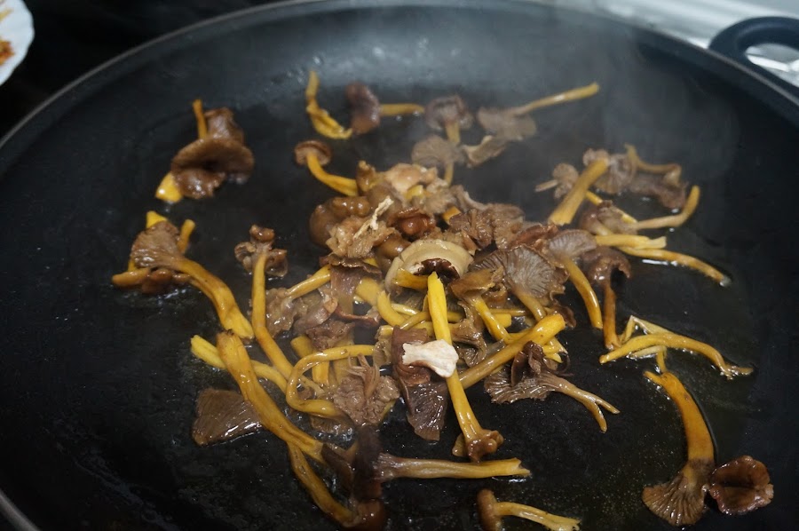En la misma paella saltearemos las setas frescas y las setas remojadas. El agua de remojar las setas se guarda. Las sacamos y reservamos.