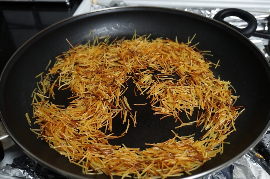 Primero freiremos los fideos, ponemos 2-3 cucharadas de aceite en la paella y pondremos los fideos y los dejaremos hasta que tomen color, iremos removiendo sin parar. Sacamos y reservamos.
