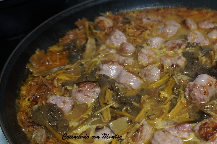 Removemos todo y ponemos el caldo y el agua de las setas secas.