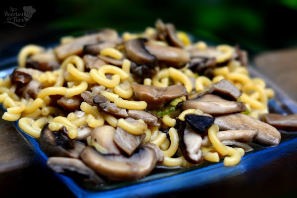 En una sartén para paellas, con un poco de aceite de oliva, rehoga el otro puerro cortado en rueditas,los ajos, luego el apio cortado en rueditas también. Agrega los champiñones y setas que has colado y dejado lo más secos posibles, cocina un poco. Saca los ajos. Incorpora los fideos y acto seguido, echa el caldo que tienes reservado.