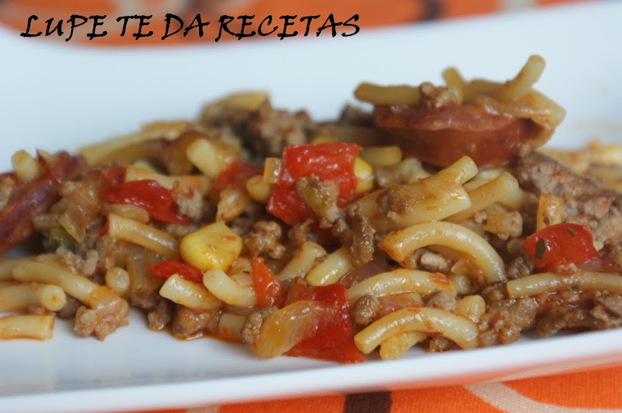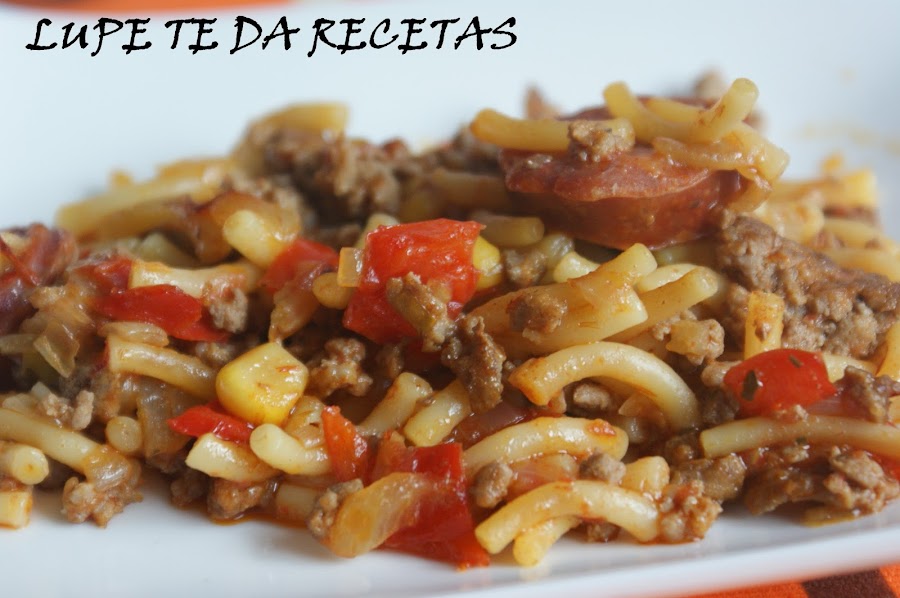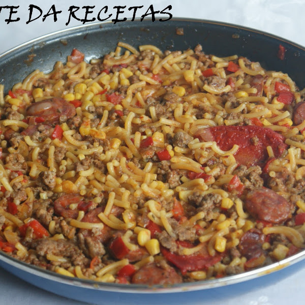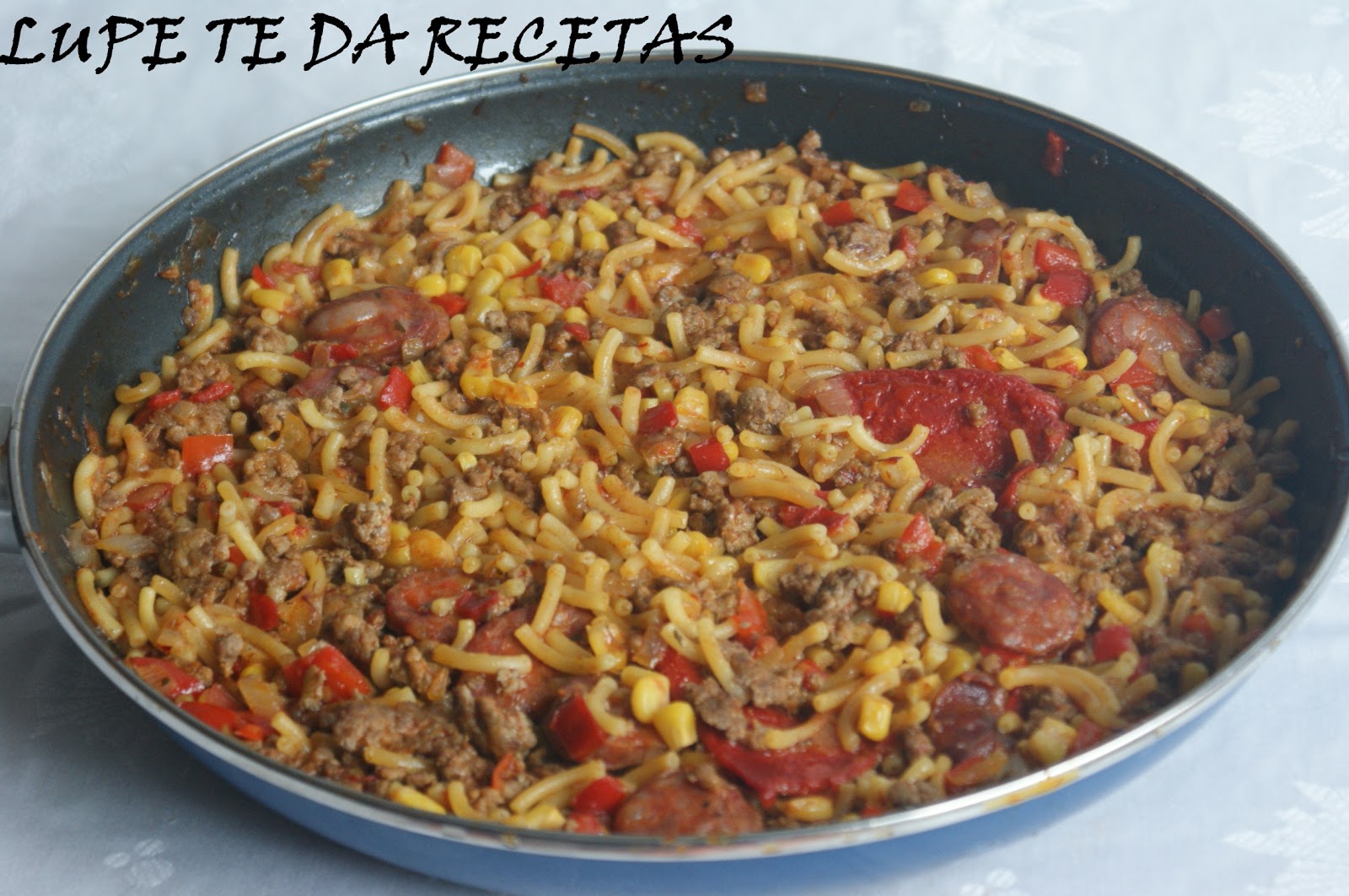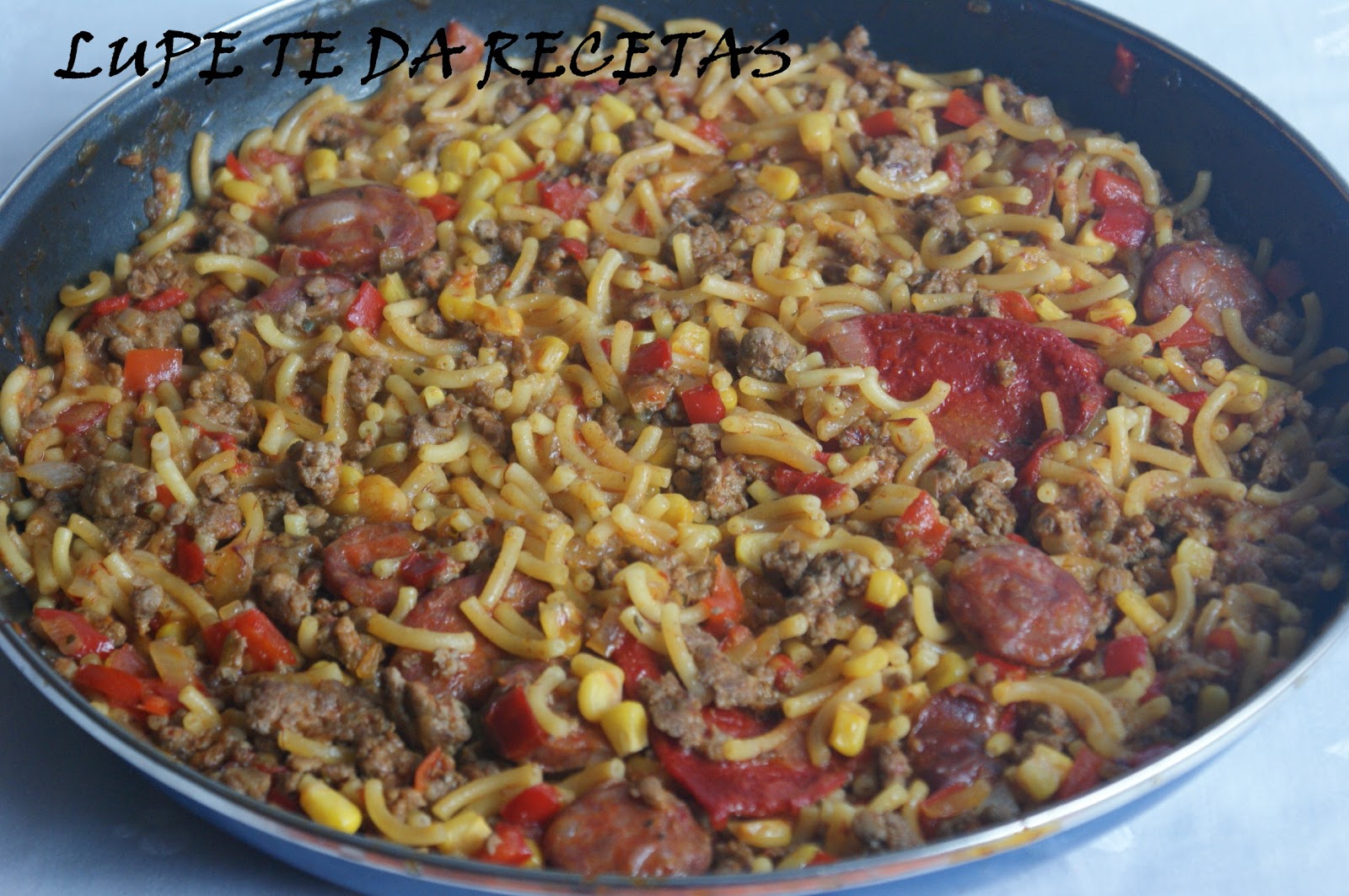 Picar finos las cebollas y el pimiento y pochar lentamente, cuando esté transparente (unos 8 minutos) añadir el chorizo cortado en lonchas finas (1 cm +/-) y la carne, revolver y dorar 10 minutos. Añadir la pimienta, la sal, el perejil y los fideos, remover y dorar un poco removiendo a menudo. Añadir el caldo y el tomate y dejar hacer unos 15 minutos.