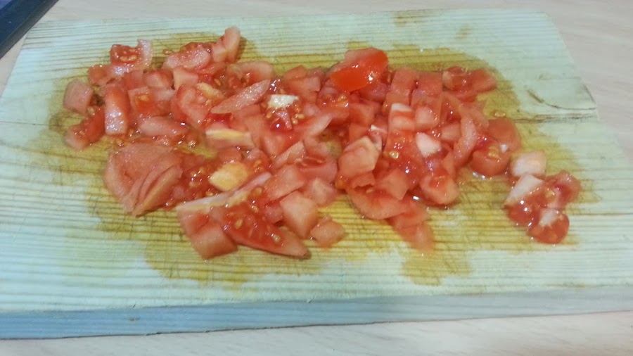 Mientras que se pocha despacito, picamos los tomates quitandoles la piel
