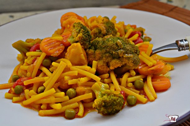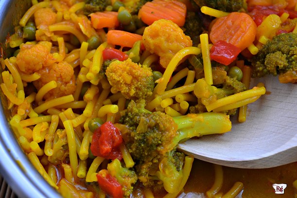 Para abrir la temporada , os traigo una receta clásica de Fideuá, resultado de la limpieza del congelador, en el que tenía unos restos de verduras que por separado no daban para mucho, pero juntas y unidas a unos fideos de fideuá, han dado como resultado un plato típico Meditarráneo.
