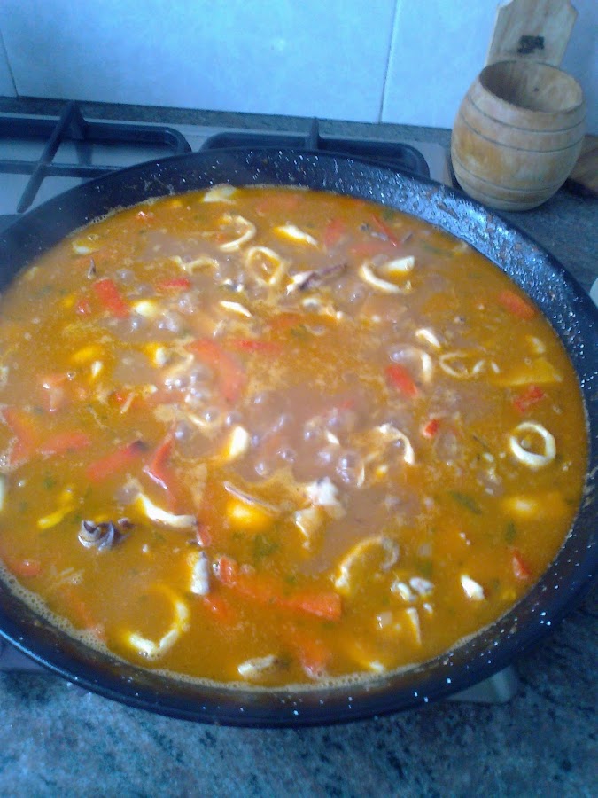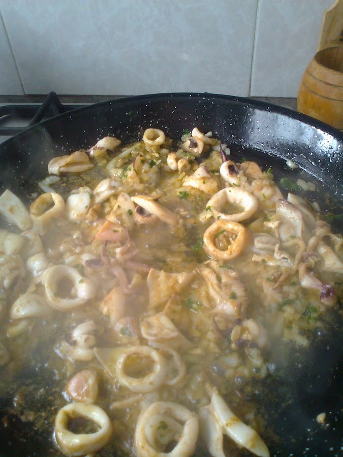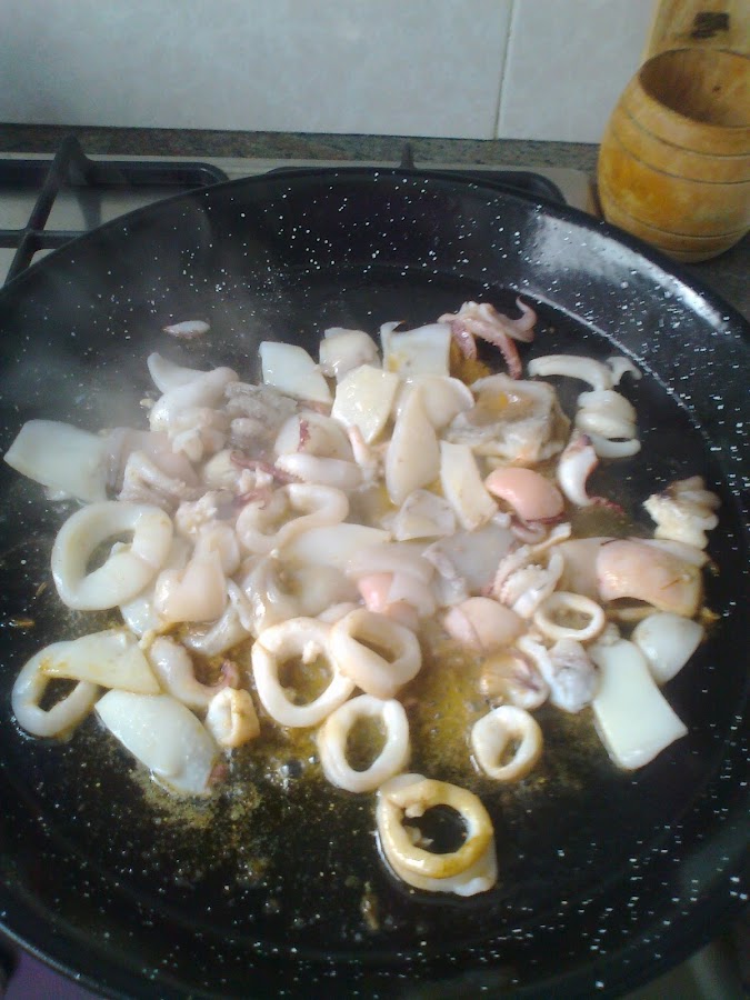 Ponemos a sofreir calamar y sepia y hasta que no se ha embebido su caldito, no le echamos