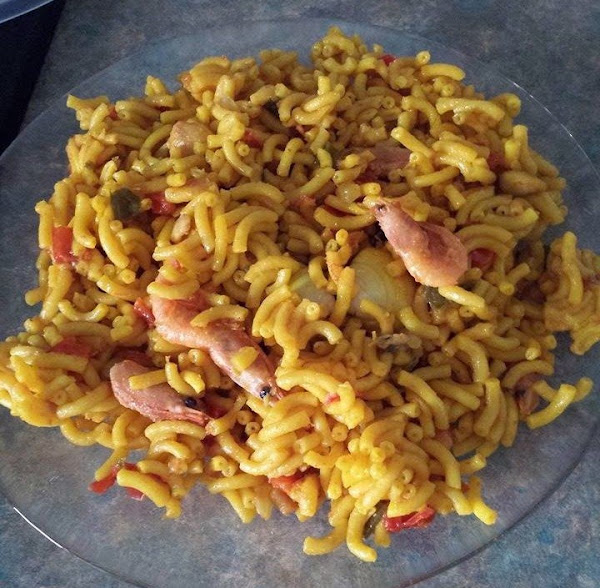 Seguidamente se echa el litro de caldo, el preparado de paella, la fideua y los dos azafranes. Se prueba de sal y corregir al gusto.