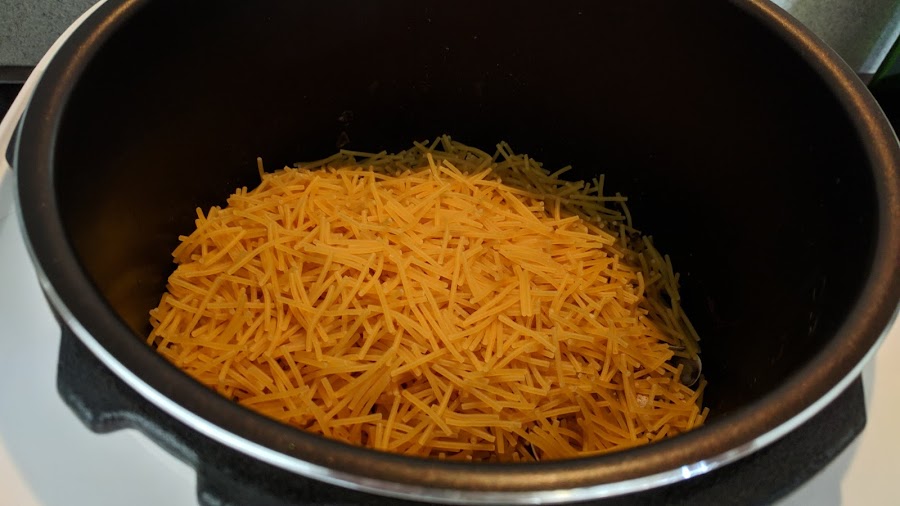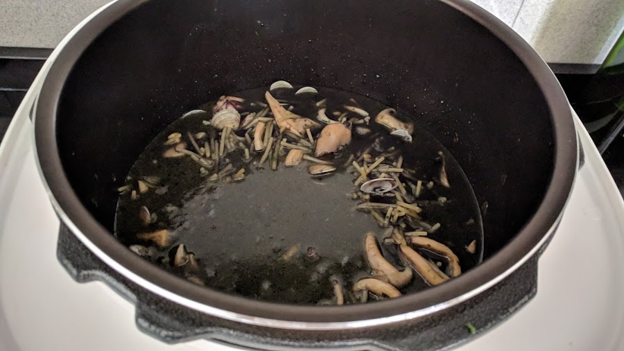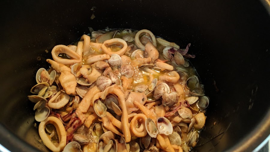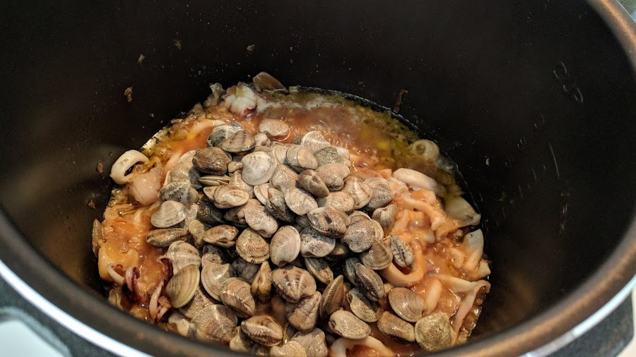 Cuando termina despresurizamos manualmente y programamos de nuevo menú guiso pero 4 minutos. Añadimos las chirlas que habremos tenido a remojo en agua de sal. Removemos