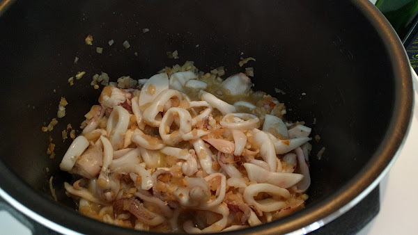 Sofreímos la cebolla y el ajo en menú sofreír a 140 grados. Salteamos en este mismo menú los calamares.