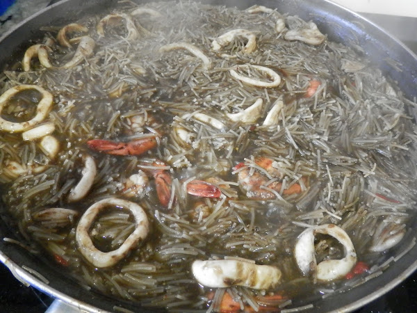 Añadimos los fideos y dejamos cocer, no dejéis mucho caldo porque los fideos tardan 3-4 minutos en cocer y no absorven mucho líquido.