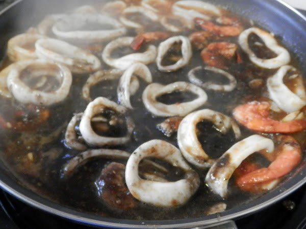 ¿Lo tenemos?Vamos a añadir la tinta del calamar, yo esta vez le eché un sobrecito, quizá le faltó otro más.Mezclamos bien y añadimos el caldo.