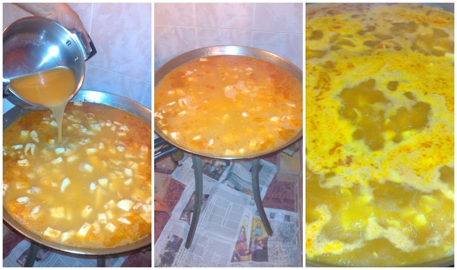 Ponemos ya el caldo de pescado, previamente calentado, si no lo estaba y dejamos que hierva junto el sofrito unos cinco minutos. Con un poco de caldo en una tacita se disuelven las hebras de azafrán y se añade a la cocción