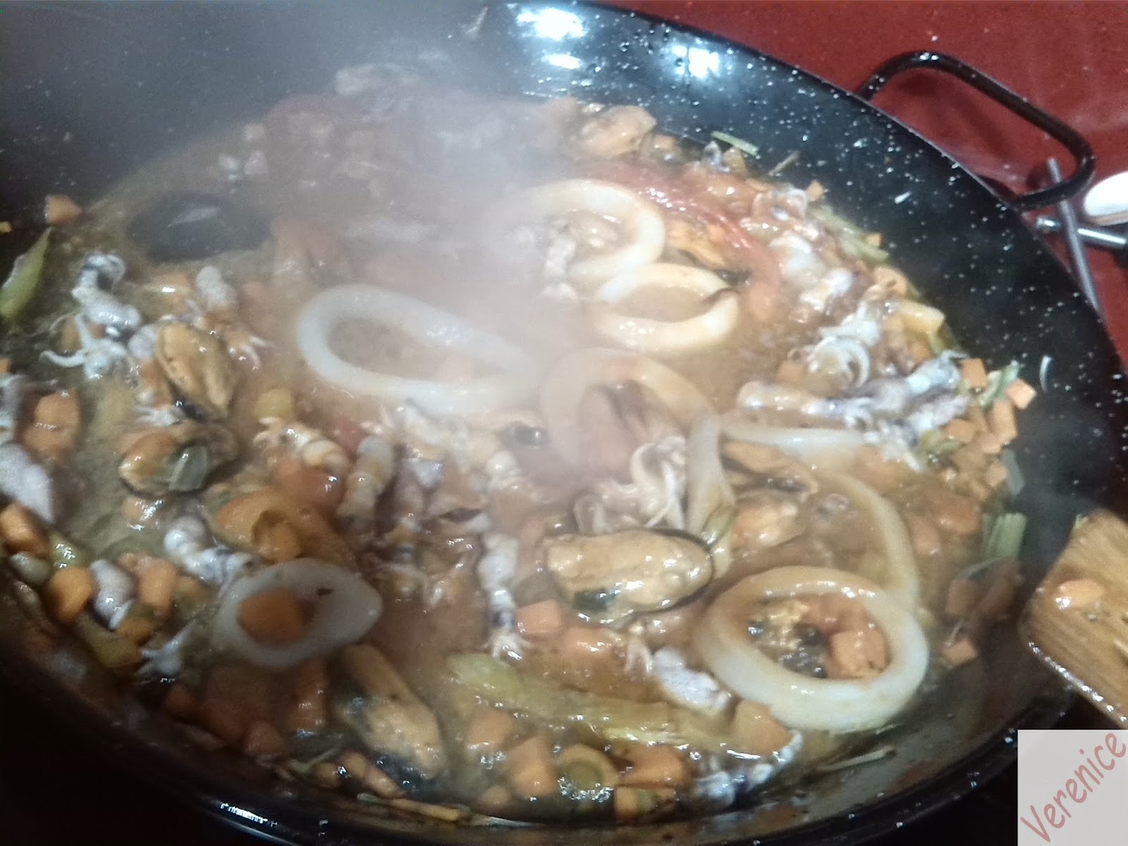 Cuando ya esté todo doradito se le añaden las anillas de calamar, los chipirones, los mejillones y las gambas, dándoles un par de vueltas nada más