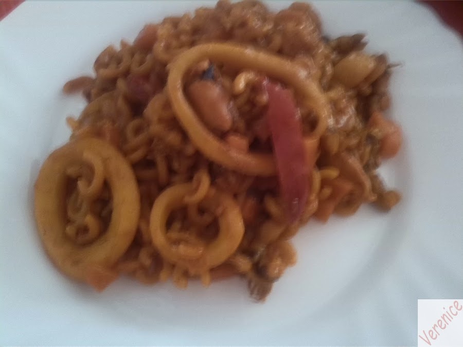 Se le incorporan los fideos y dándole unas vueltas por la sartén para que se doren un poco, se cubre con el pimentón, añadiéndole el fumet poco a poco. La fideuá hay a quien le gusta caldosa y a quien le gusta sequita, yo la hice así, por eso no llegué a gastar todo el fumet, cuando ya los vi casi listos de textura probé el caldo y no tuve que añadirle nada de sal porque estaba en su punto. Deben quedar como la pasta, al dente.