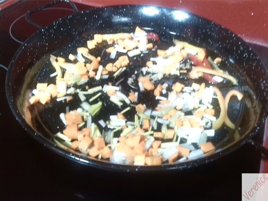 Se hace el sofrito con todas las verduras y vegetales, incorporando por último el tomate