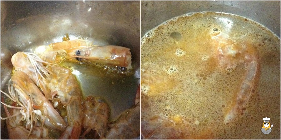 Primero prepararemos un fumet rápido de langostinos. Para ello, pelamos 6 de los langostinos y en una cazuela con un poco de aceite de oliva sofreímos las cabezas y las cáscaras. Cuando ya hayan soltado un poco de jugo, vertemos medio litro de agua en la cazuela, llevamos a ebullición y dejamos cocer a fuego medio durante 15 minutos. Colamos el agua y reservamos.