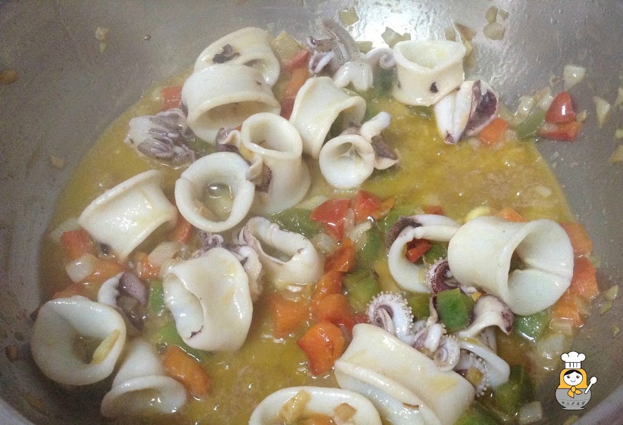 Cuando estén blandas echamos los chipirones y dejamos que se hagan con las verduras durante un par de minutos.