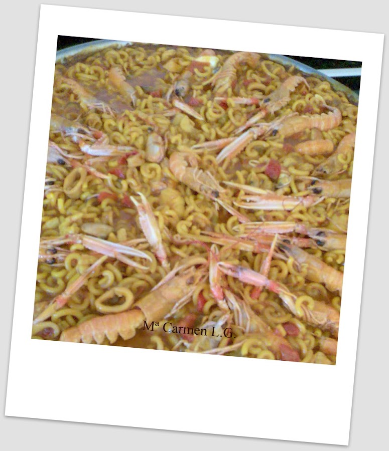 Se incorporan, pasado el tiempo, los calamares y el rape. Cuando se ha mareado el conjunto se echan los fideos, se fríen 3 minutos y se añade el pimentón. Remueve.