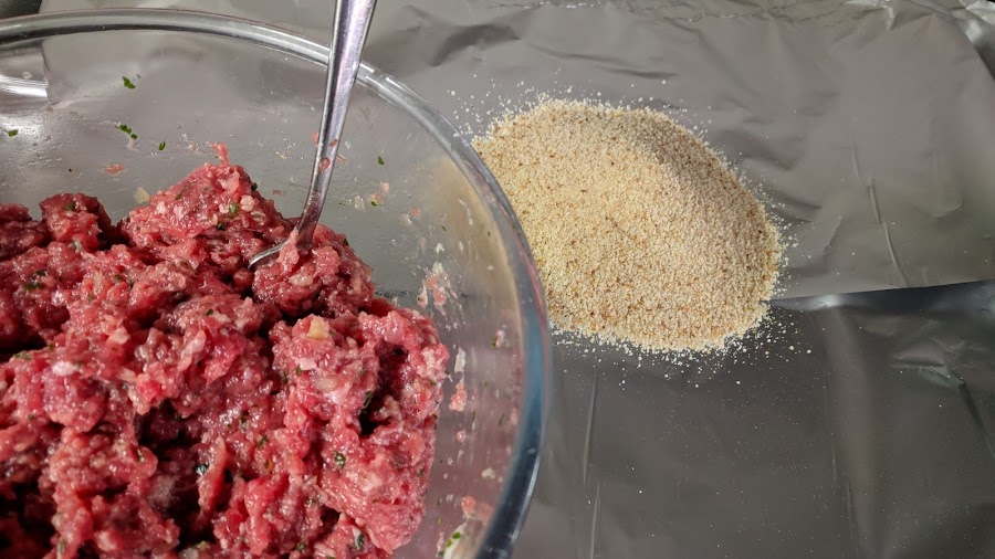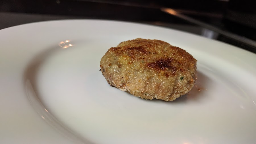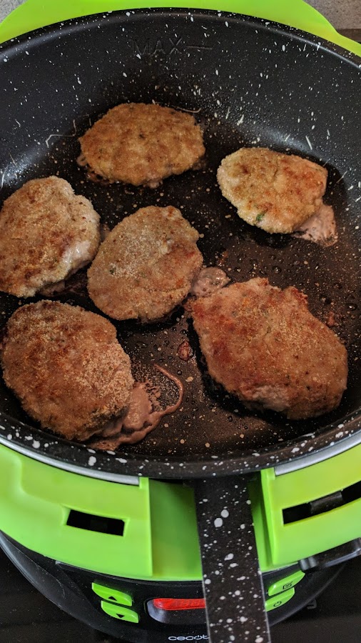 Enciende la turbocecofry y programa menú plancha a 240 grados. Pon un flus de aceite en la base de la cubeta plana y deja que se caliente. Haz porciones y envuelve muy ligeramente en pan rallado