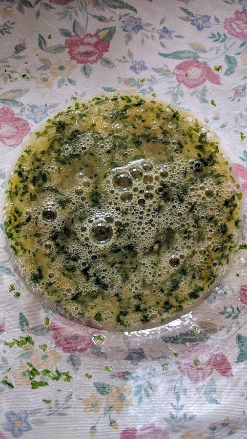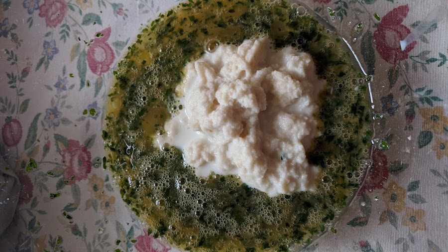 Pon en un bol los huevos, ajo y perejil (puedes poner congelados) y bate bien
