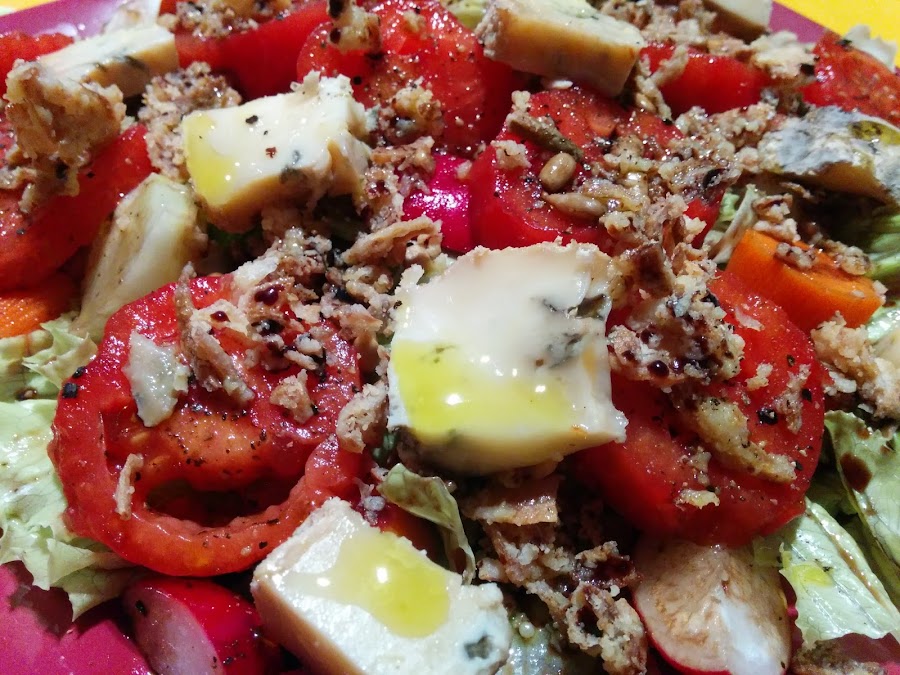 Ensalada de Gorgonzola, Cebolla Crujiente y Pipas de Va de Teca
