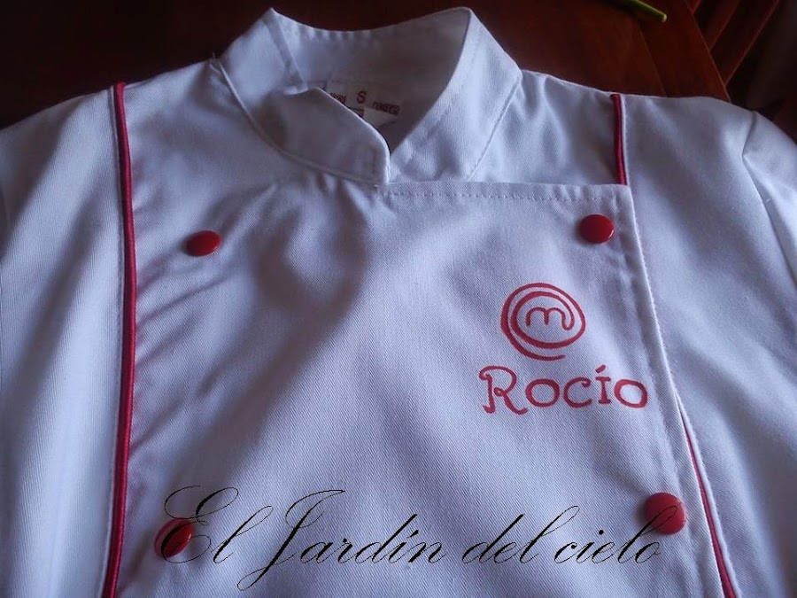 Le compraron esta chaqueta de cocinera con su gorro y todo porque a ella le gusta mucho mastercheff y me la mandaron para que le pintara su nombre y el logo.