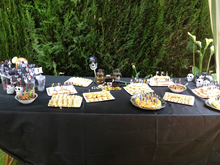 La mesa de la comida, nosotros la cubrimos con una tela negra y adornos que íbamos reciclando de una casa y otra. Rebuscando siempre se tienen cosas por casa. Los vasos y las pajitas negras los decoré con unas banderas pirata que imprimí.Y los pinchos con palillos en forma de espadas.