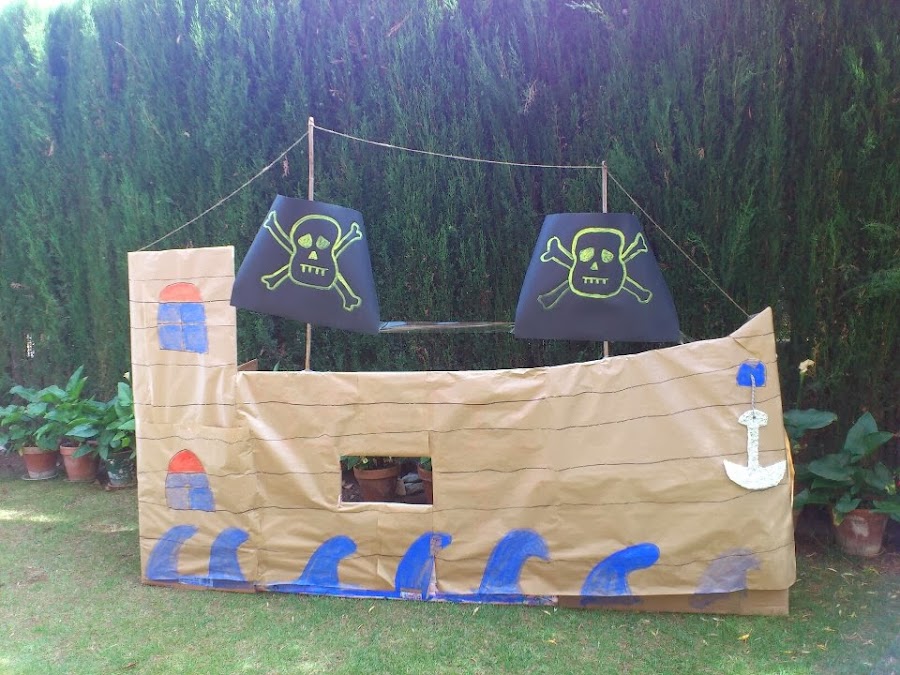 Me gustó mucho la guerra en el barco pirata. Sí me llevó más tiempo hacer el barco, pero tampoco era nada complicado. Junté cartones grandes, hice la forma del barco, lo forré con papel continuo marrón, le hice las ventanas, unas banderas y ¡al abordaje!