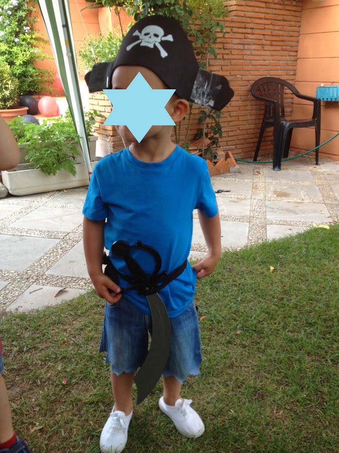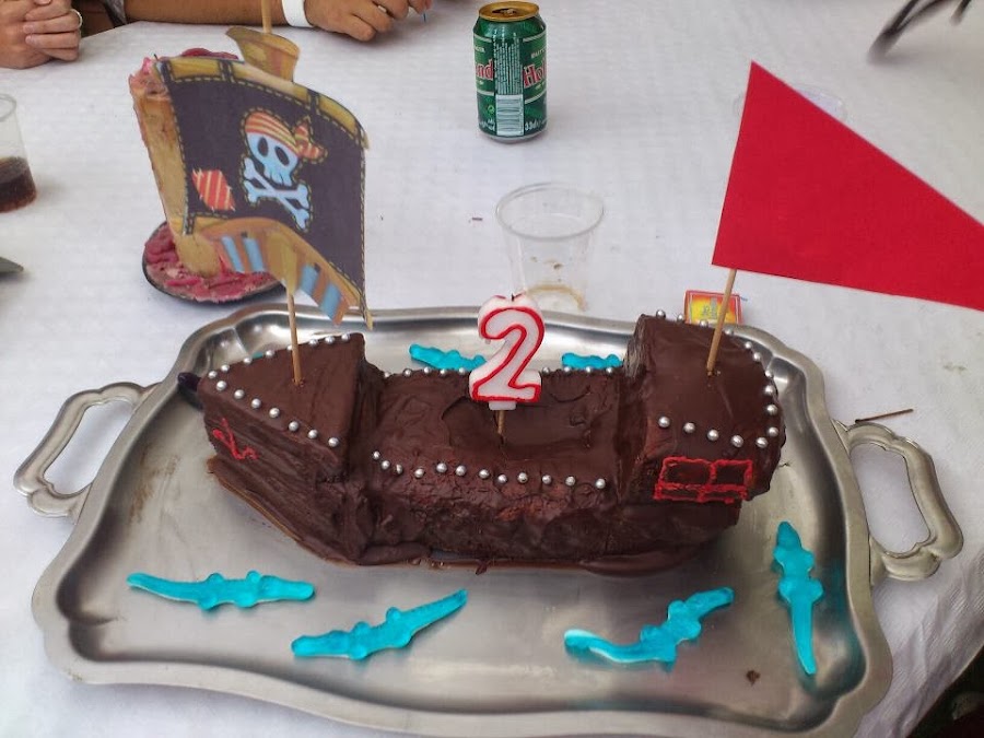 Y por último, la tarta. Si sois unas artistas haciéndolas, es estupendo, pero si sois de las mías, que la intención es lo que cuenta, yo os aconsejo que lo importante es lo de fuera, porque los niños casi nunca se la comen. La que yo hice no estaba rellena de nada, solo era bizcocho con cobertura de chocolate, pero la cara que se le puso a mi hijo de ver un barco pirata me compensó todo el esfuerzo.