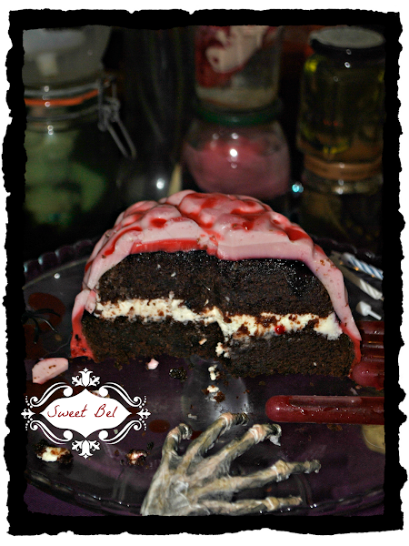 Para la tarta prepare un bizcocho de cerveza guiness la rellene de queso mascarpone y mermelada de frutos rojos y la cubrí con gelatina y un molde de un cerebro que me trajeron de Londres otra pareja de los invitados. este es el resultado por fuera y por dentro!!!
