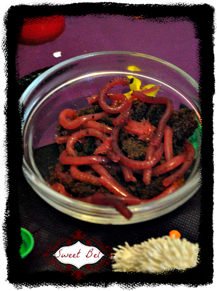 Una cosa muy asquerosa y que parecía real fueron unos gusanitos o lombrices que hice con gelatina roja. Los puse en un bol sobre galletas oreo desmenuzadas y daban el pego totalmente!!! juzgar vosotros!!! este es otro tutorial que haré el año que viene junto con los ojos de gelatina y las calabazas