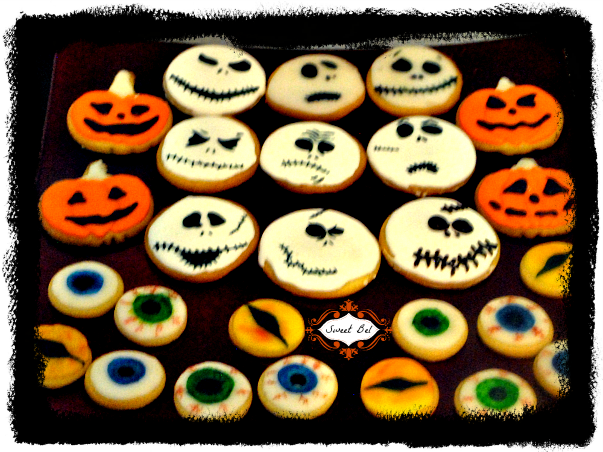 Teníamos galletas de todo tipo, había unas de naranja, otras de limón y otras que ahora mismo no me acuerdo de que eran, tenían diferentes formas, había momias, estaba jack (que me encanta y ya es un clásico) había diferentes tipos ojos, dedos de bruja, piruletas con fantasmitas y huesitos, gatos, muñecos cosidos...... y no se que mas!!! una burrada de cantidad. aun hoy sigo teniendo en casa y ya no puedo comer mas dulce. he engordado dos kg.