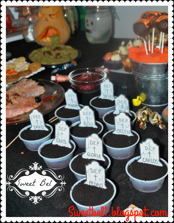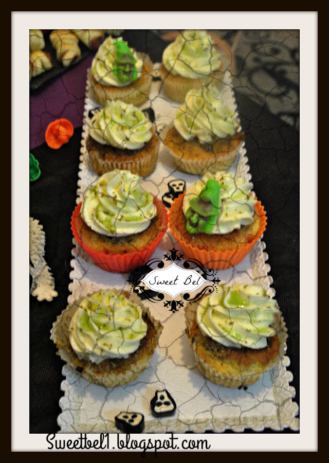 Teníamos cup cakes de mojito con moco verde!! jajajaja y cupcakes de cerveza negra con fantasmitas de queso mascarpone, de estos últimos, como fue lo ultimo que puse, ya que se me olvidaban, no tengo fotos, pero quedaron muy graciosos. Tambien habia otros cupcakes decorados con tumbas que los trajeron tambien los invitados.