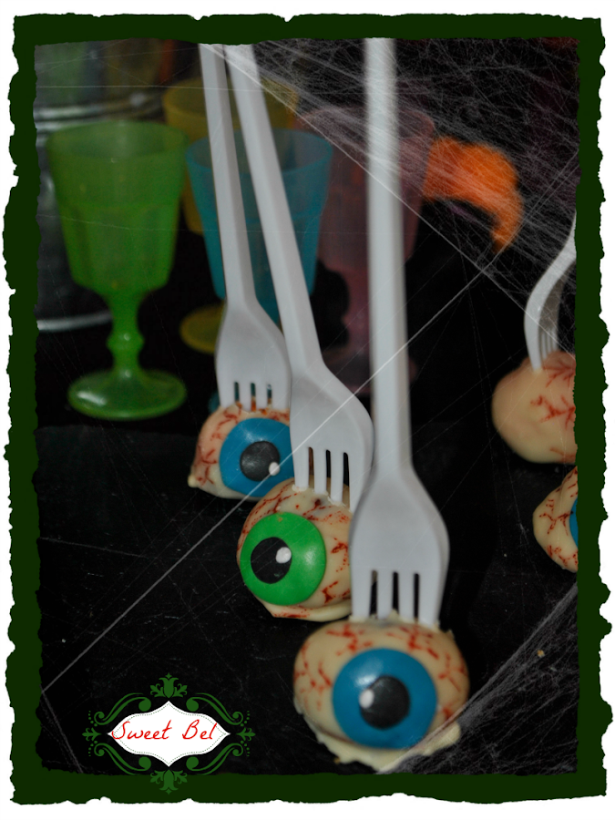De salado no hubo mas, pero de dulce había unos cake pops de ojo y otros de chocolate negro con decoración naranja, los de ojos, en vez de llevar un palito, llevaban un tenedor pinchado, un poco asqueroso, pero tuvieron mucho éxito, de hecho no sobro ninguno.