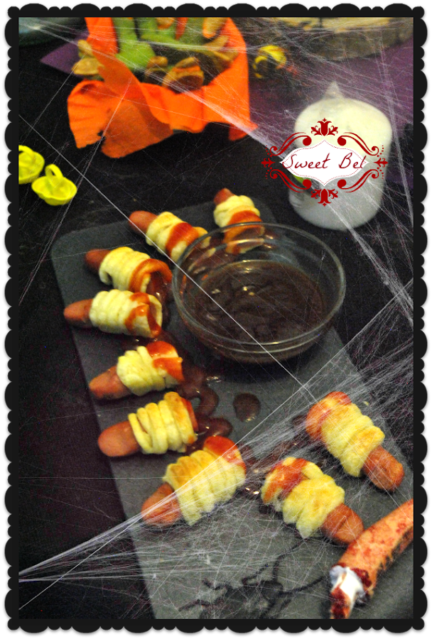 había unos dedos de bruja cortados, había momias y unos amigos se lo curraron un montón y prepararon una ensaladilla con forma de fantasma que a mi personalmente me encanto (estaba rica no, lo siguiente), y un pastel de carne con forma de mano que daba algo de grima!!!! jajaja